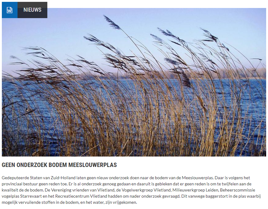 Gedeputeerde Staten van Zuid-Holland laten geen nieuw onderzoek doen naar de bodem van de Meeslouwerplas waar de Vrienden e.a. om verzocht hebben. Daar is volgens het provinciaal bestuur geen reden toe.