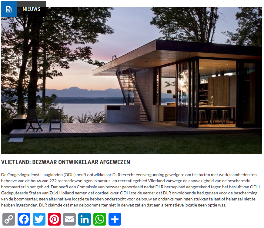 De Omgevingsdienst Haaglanden (ODH) heeft ontwikkelaar DLR terecht een vergunning geweigerd om te starten met werkzaamheden ten behoeve van de bouw van 222 recreatiewoningen in natuur- en recreatiegebied Vlietland vanwege de aanwezigheid van de beschermde boommarter in het gebied.